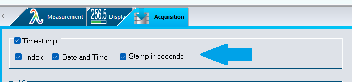 When generating log files in the Acquisition panel of PC-Gentec-EO, enable Timestamp and check all boxes. This ensures every measurement is time-stamped for easy reference.